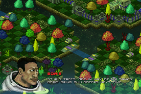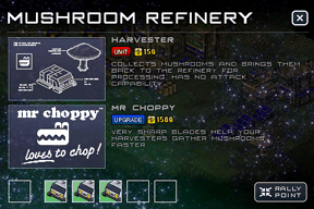 Players establish a base, and send out mushroom harvesters to collect mushrooms - each load they bring back will earn them credits. Credits can be spent on new buildings and technology upgrades, as well as defensive forces to protect against rival mushroom gathers.